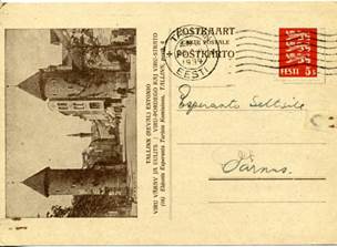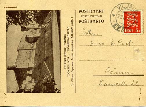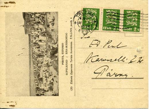 Drei Karten wurden 1934, eine weitere 1937 postalisch genutzt, sie sind aus Viljandi (1) und Tallinn (3) stammend an die Esperanto Gesellschaft (Esperanto Seltside) in Pärnu bzw. den dortigen Leiter gerichtet; mit einem grünen dreizeiligen Stempel ist zweimal der Absender angegeben: ESPERANTO ASOCIO de ESTONIO, Tallinn, Postkast 6.