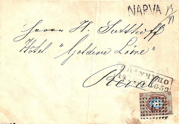 Der Brief aus Narwa nach Reval wurde am 13. April 1859 aufgeliefert. Das Postwertzeichen wurde laut Vorschrift vom 17. August 1858 mit dem rechteckigen Punktnummernstempel „6" entwertet. Da in der frühen Phase der Einführung der Briefmarken den Postämtern nur die vorphilatelistischen Stempel zur Verfügung standen, wurde das Auflieferungsdatum handschriftlich neben dem Ortsstempel eingetragen. Als Ankunftsstempel wurde der bekannte Rahmenstempel von Reval abgeschlagen.