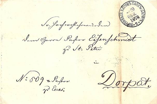 Der Brief kommt aus Ecks (Äksi), etwa 20 km nördlich von Dorpat, als Dienstbrief ist er portofrei. Am 18. September 1878 wurde der Brief geschrieben, jedoch erst am 20. September vermutlich von einem Mitglied der kleinen Gemeinde in Kaarepere (der 7. Station auf der Strecke von Taps nach Dorpat) in einen Bahnpostwagen geworfen,. Das zeigt die querstehende Bahnhofsnummer im Stempel neben dem Datum an. Der Bote fuhr demnach in nördlicher Richtung und sogar am näher gelegenen Haltepunkt vorbei.
